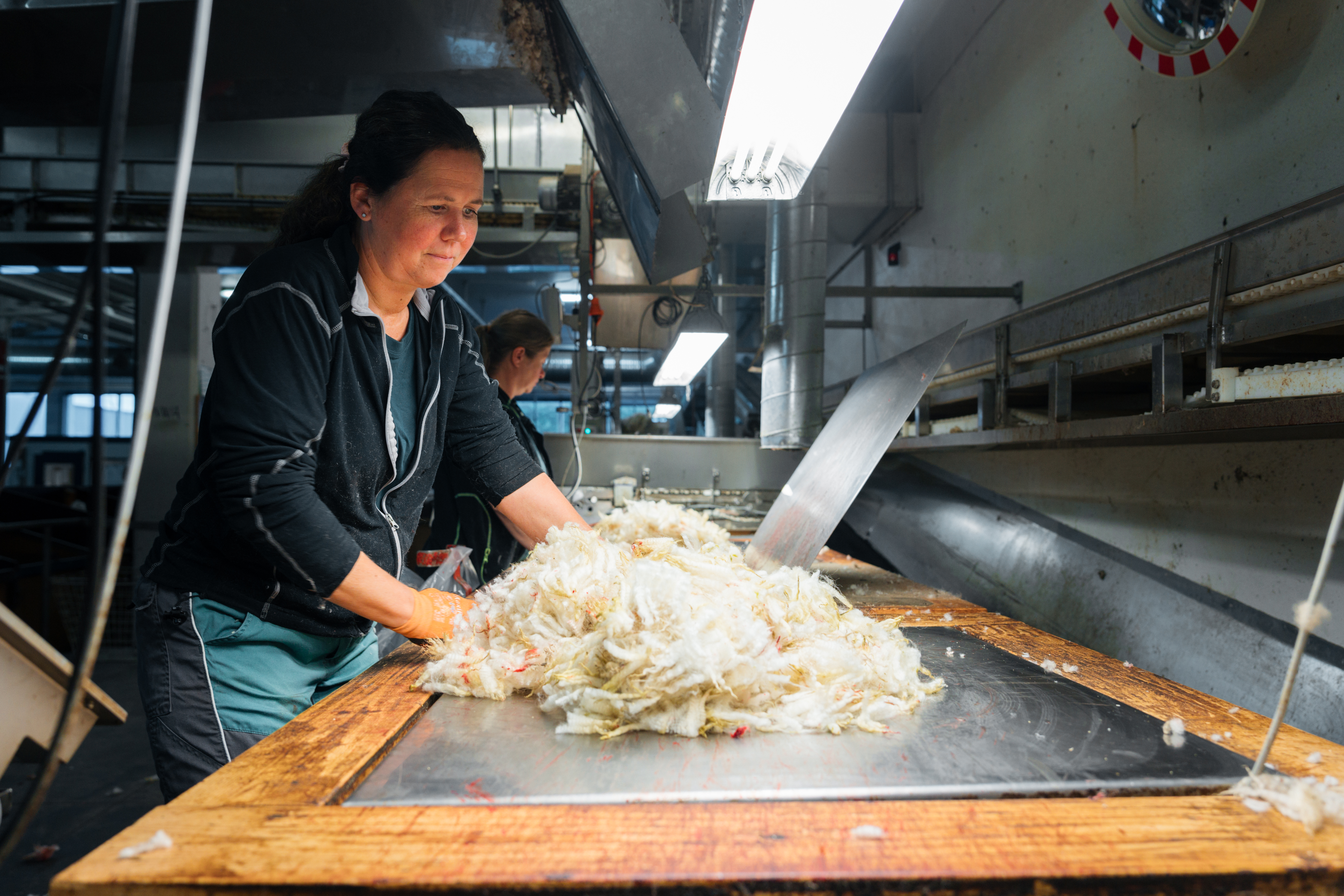 I anlegget på Forus kommer ull på samlebånd fra etasjen over, der står ni innleide klippere som klipper lammene. Men det er nå, i høysesongen som er på topp i september. Resten av året sorteres mye såkalt sekkeull som klippes ute på gårdene.